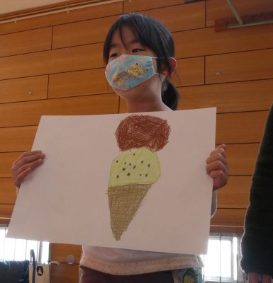 ①1年生は、「自分の好きなもの」を画用紙に描いて一人ずつ発表しました。好きな食べもの、好きなあそび、好きな場所、なんでもOK。練習では恥ずかしくて声が出なかった子もしっかりと発表していました。